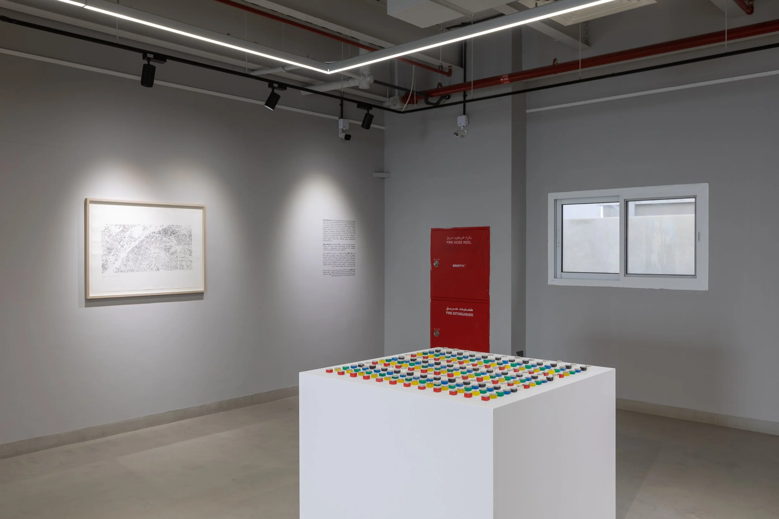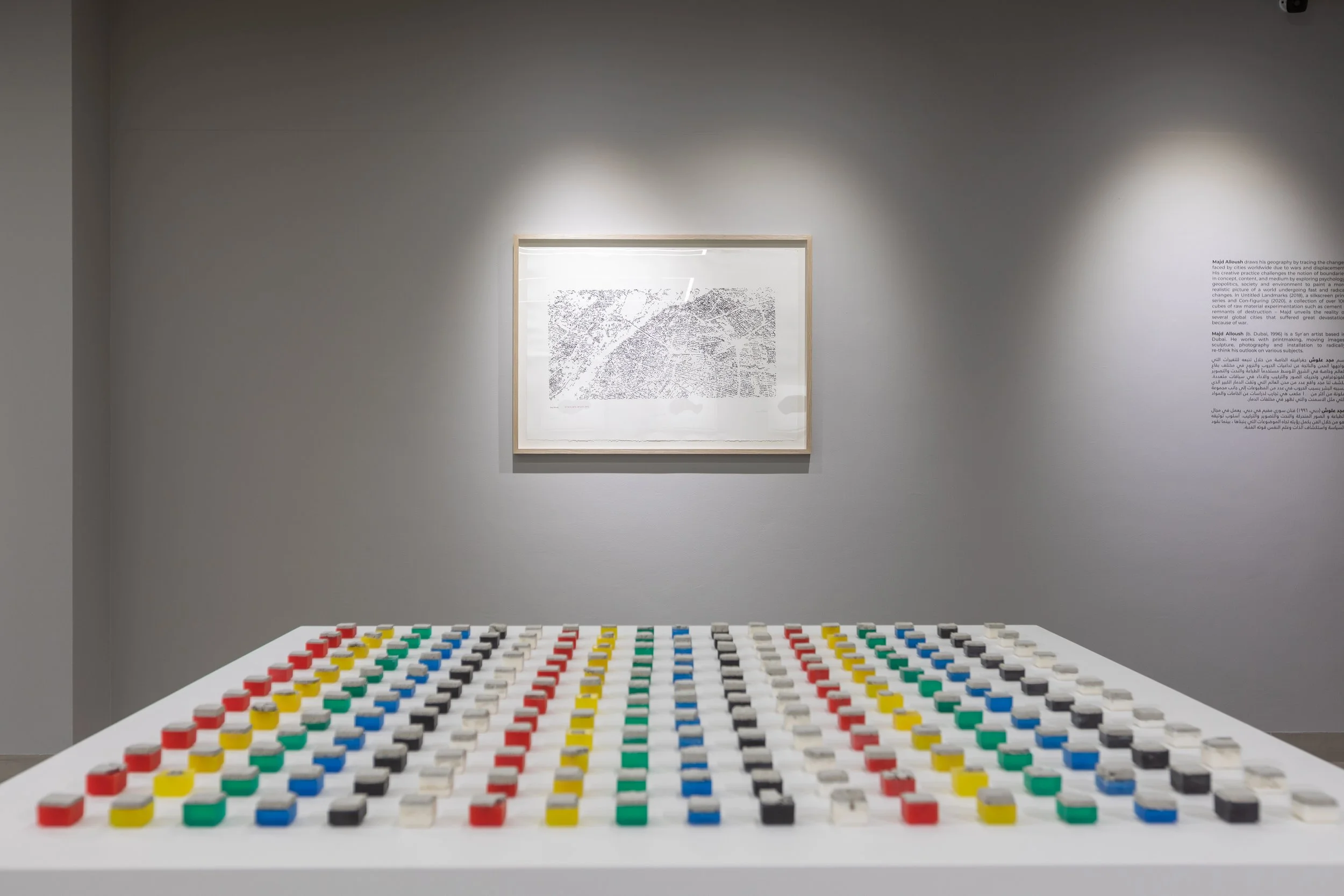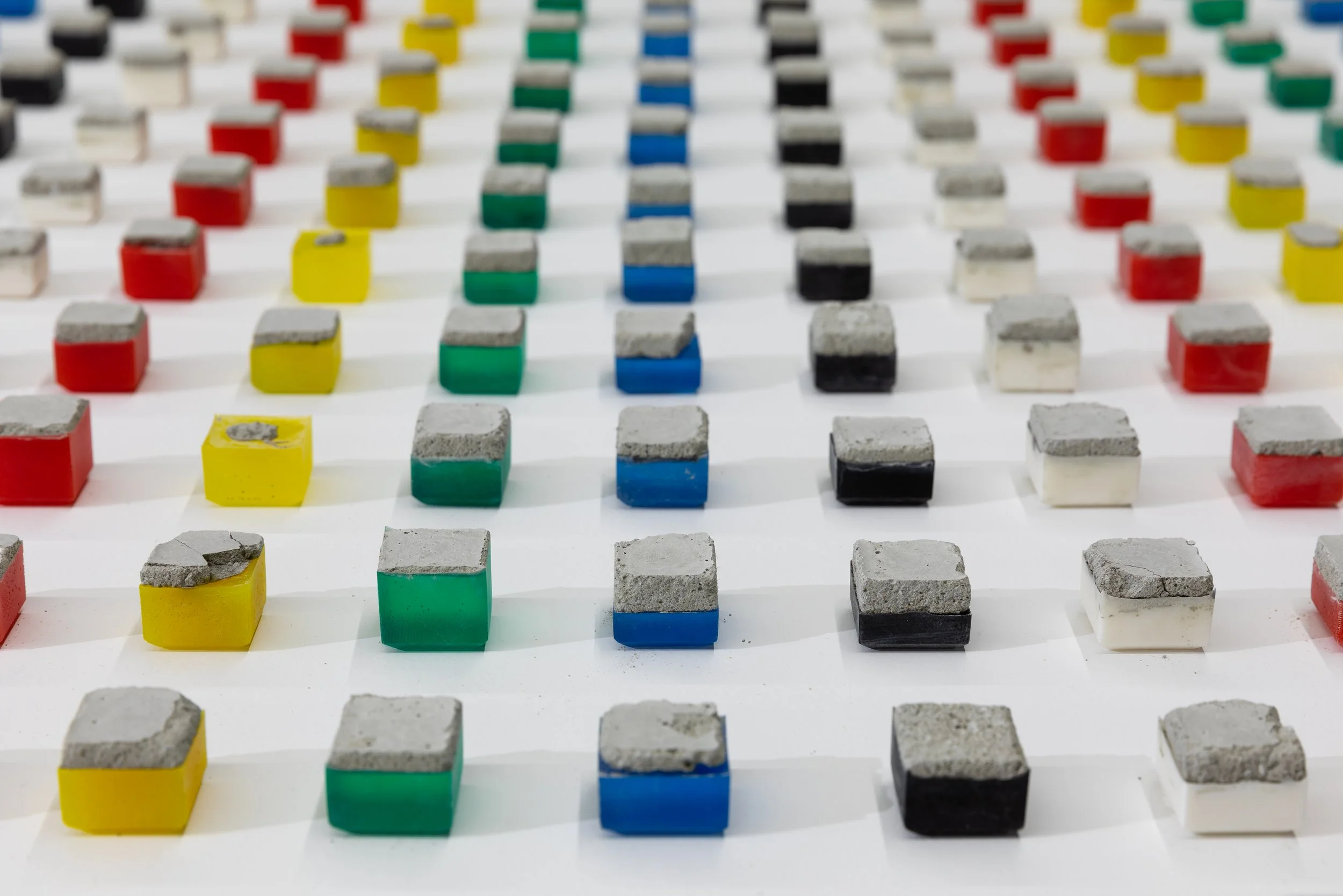 Con-figuring (2020) is a multi-sensory installation by Majd Alloush that confronts the cultural and physical devastation caused by war, particularly in Syria. Comprising approximately 190 hand-cast 5 x 5 x 5 cm cubes, the work uses concrete as a base symbolizing ruin and translucent resin pigmented in red, white, black, blue, green, and yellow, each color representing a political faction involved in the war. The resin layers vary in height, quantifying the scale of destruction attributed to each group. Echoing the looting, erasure, and commodification of Syria’s cultural heritage, the cubes resemble fragmented ruins of once-sacred historical sites. Accompanying the sculptural installation is a 16mm experimental film, where flickering dots punctuate the screen, each marking a place the artist once visited, now marred by conflict or absence. Through this tactile and cinematic language, Con-figuring maps a personal and geopolitical geography, examining how war configures not only land but memory, identity, and belonging.