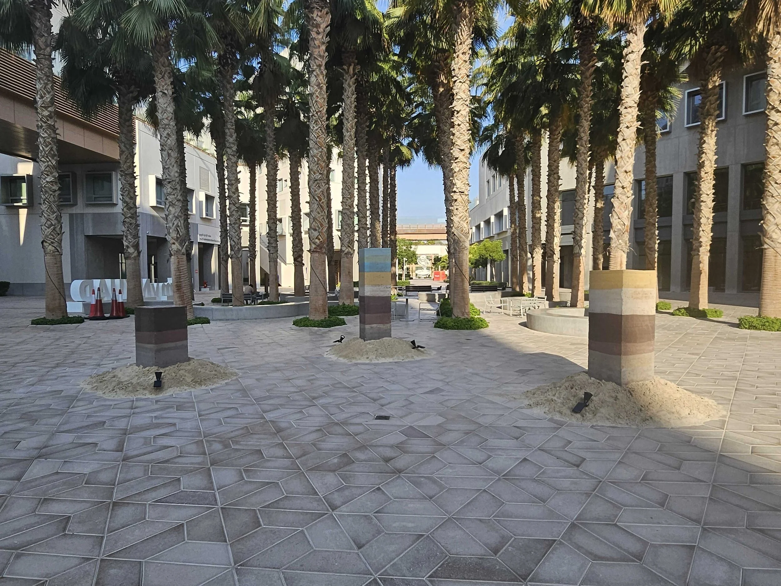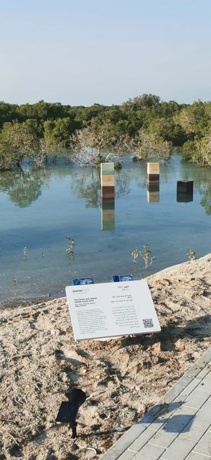 The sculpture’s color gradient is derived from the mangrove’s layered environment: beginning at the base with dark, nutrient-rich soil; transitioning upward through pale beach sand, shades of water blue, vibrant greens of shoreline flora; and culminating in a summer-hued sky blue—an homage to the arid, expansive sky of the UAE’s warmer months.