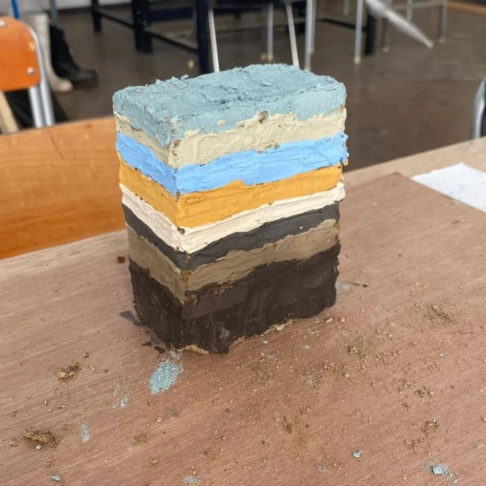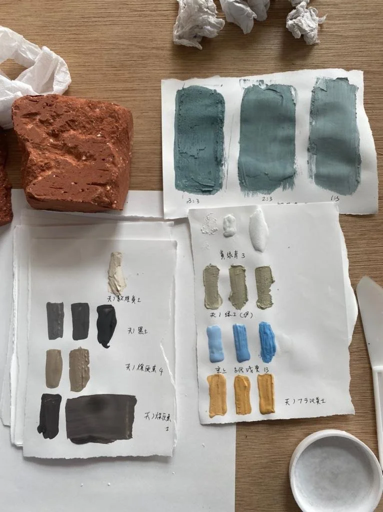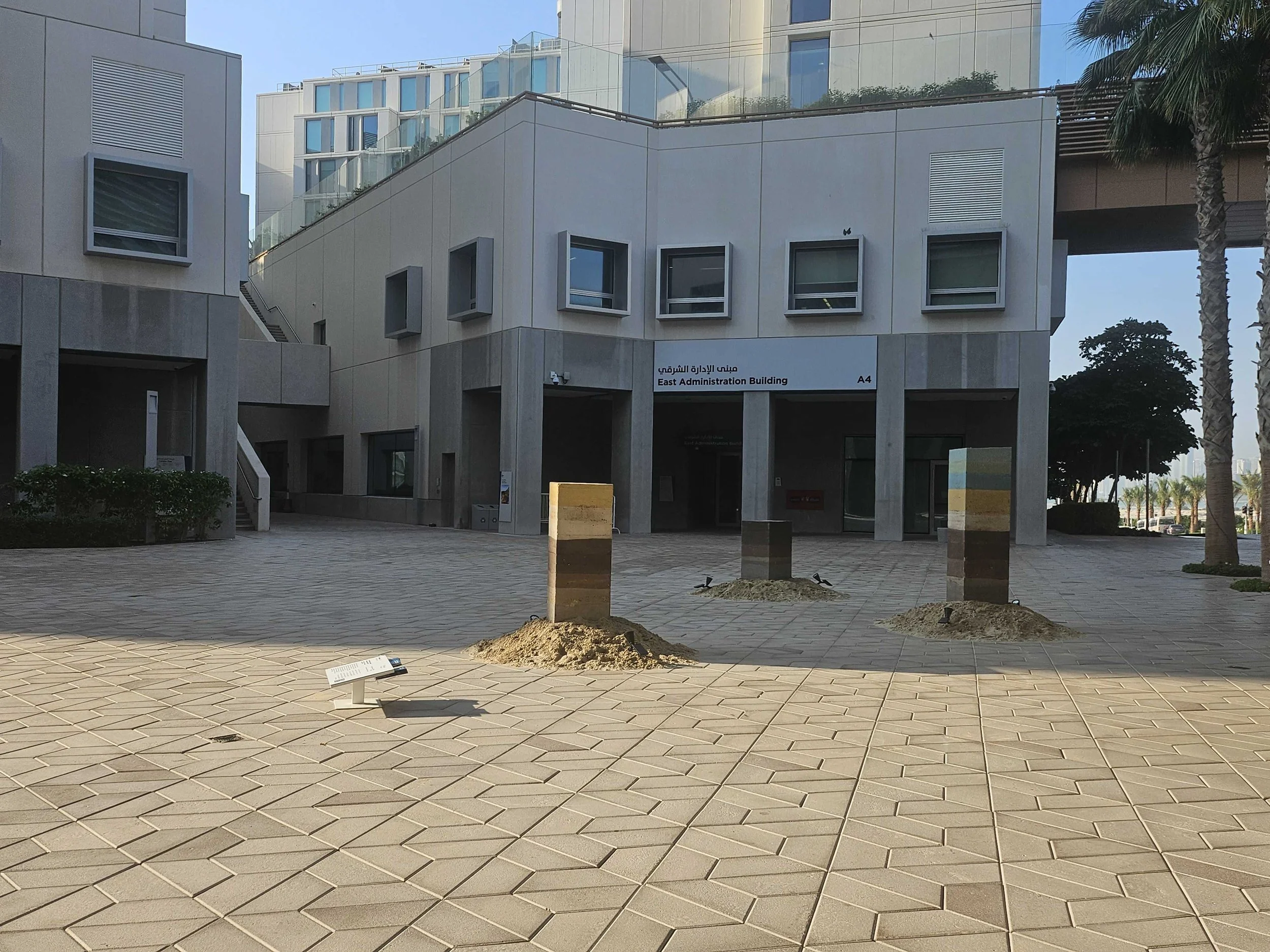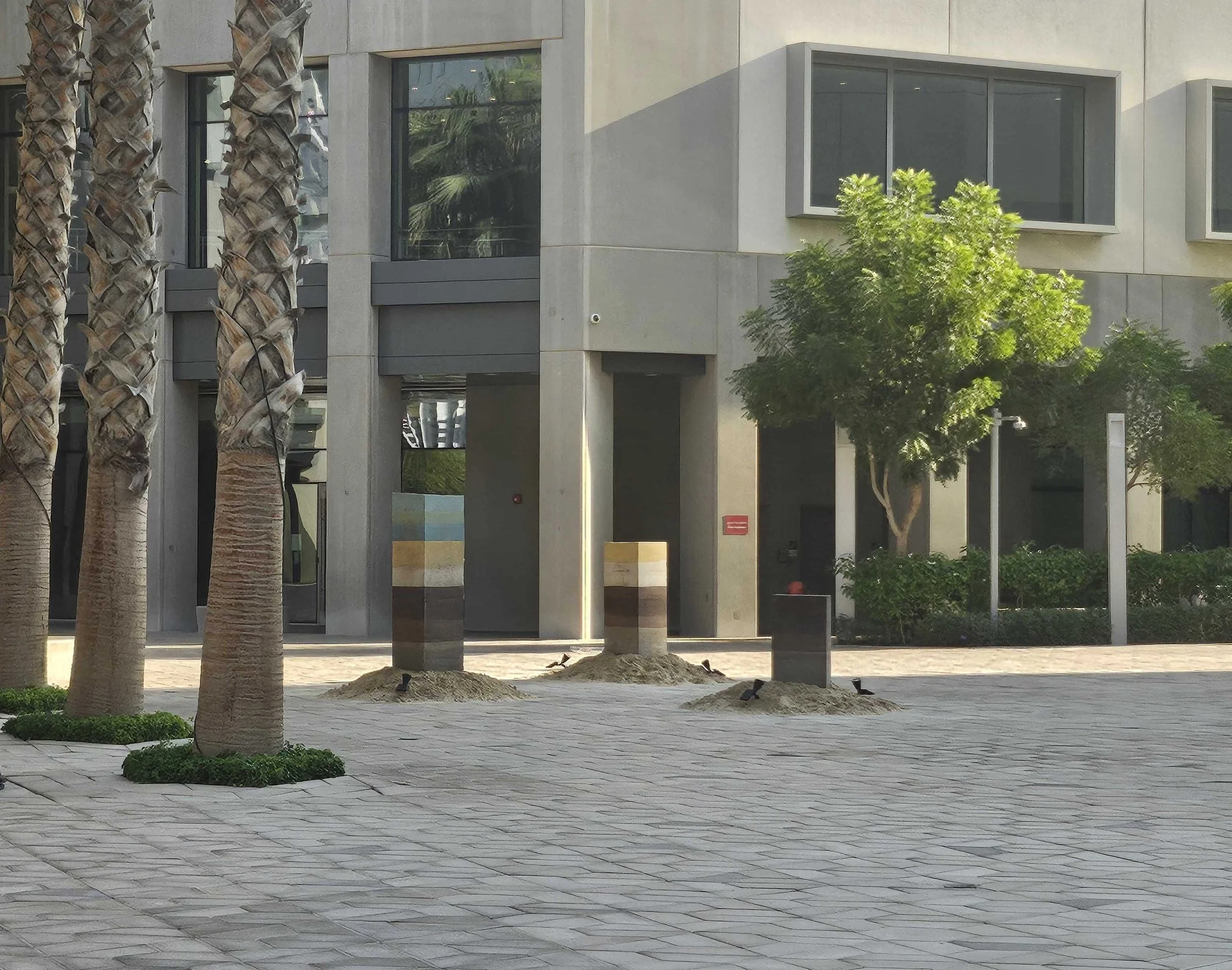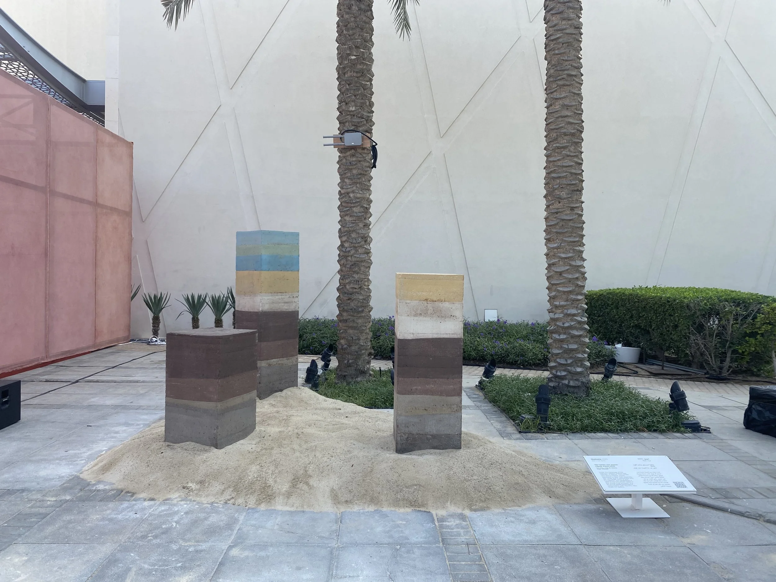 The project employs the ancient building technique of rammed earth, using a composition carefully tailored by the artist to respond to materials native to the UAE. Layers of natural soil, limestone powder, mineral pigments, shoreline compost, and organic matter such as wood chips, crab shells, dried leaves, and roots are compacted into sculptural form using hand-crafted rammers.